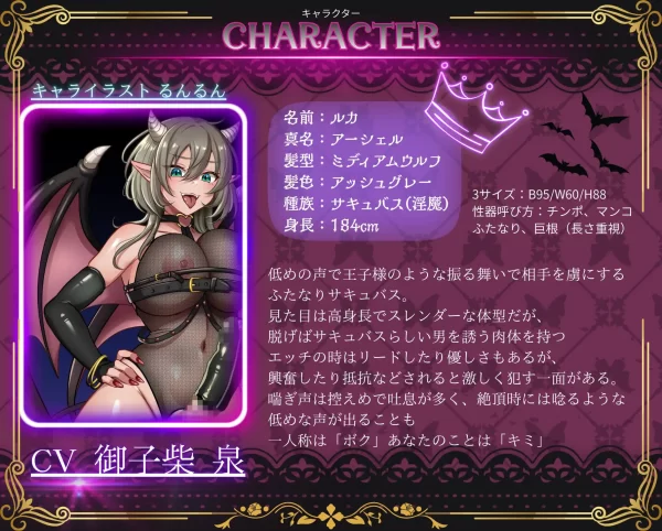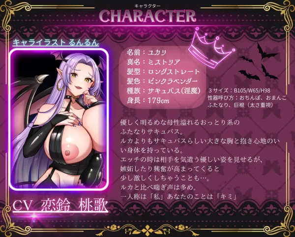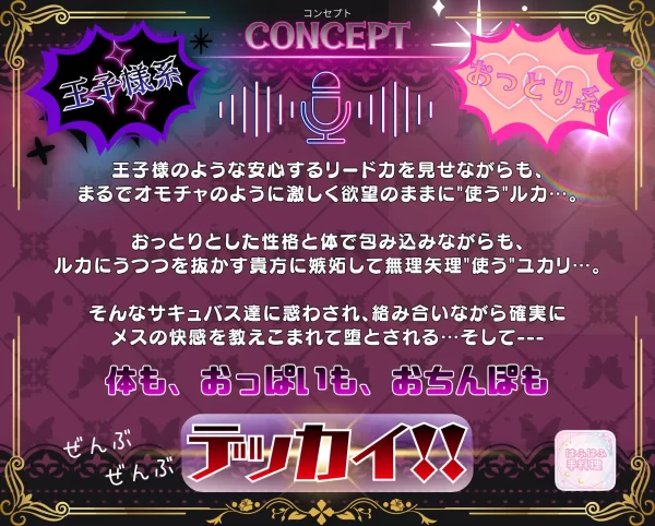 王子様のような安心するリード力を見せながらも、まるでオモチャのように激しく欲望のままに”使う”ルカ…。 おっとりとした性格と体で包み込みながらも、 ルカにうつつを抜かす貴方に嫉妬して無理矢理”使う”ユカリ…。そんなサキュバス達に惑わされ、絡み合いながら確実にメスの快感を教えこまれて堕とされる…そして— 体も、おっぱいも、おちんぽも デッカイ!!